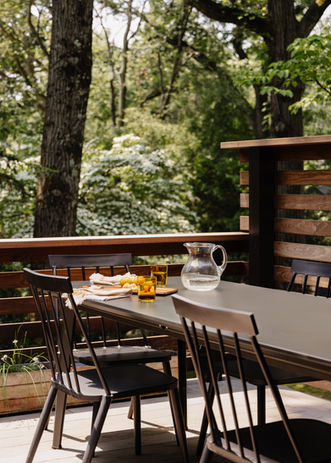 We replaced the original single pane, custom-sized windows with a high-performance upgrade, framed in extended wood jambs made from thermally modified lumber. This material was selected for its durability and rich, natural tone. That same wood was used for the new deck rail and privacy screen, tying the exterior details together. To preserve the original rain chain, we wrapped the new back deck stair around it, turning a functional detail into a quiet focal point.